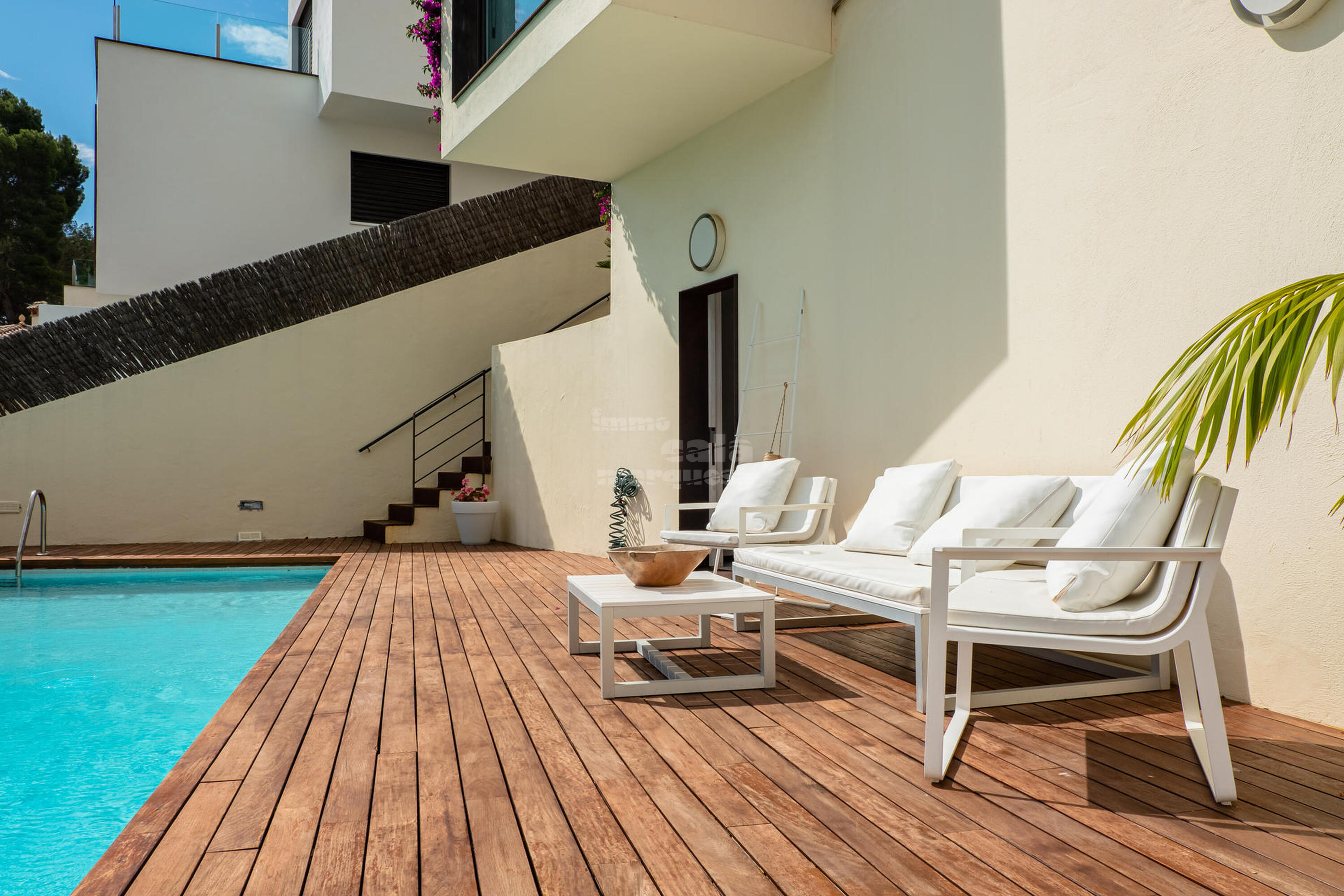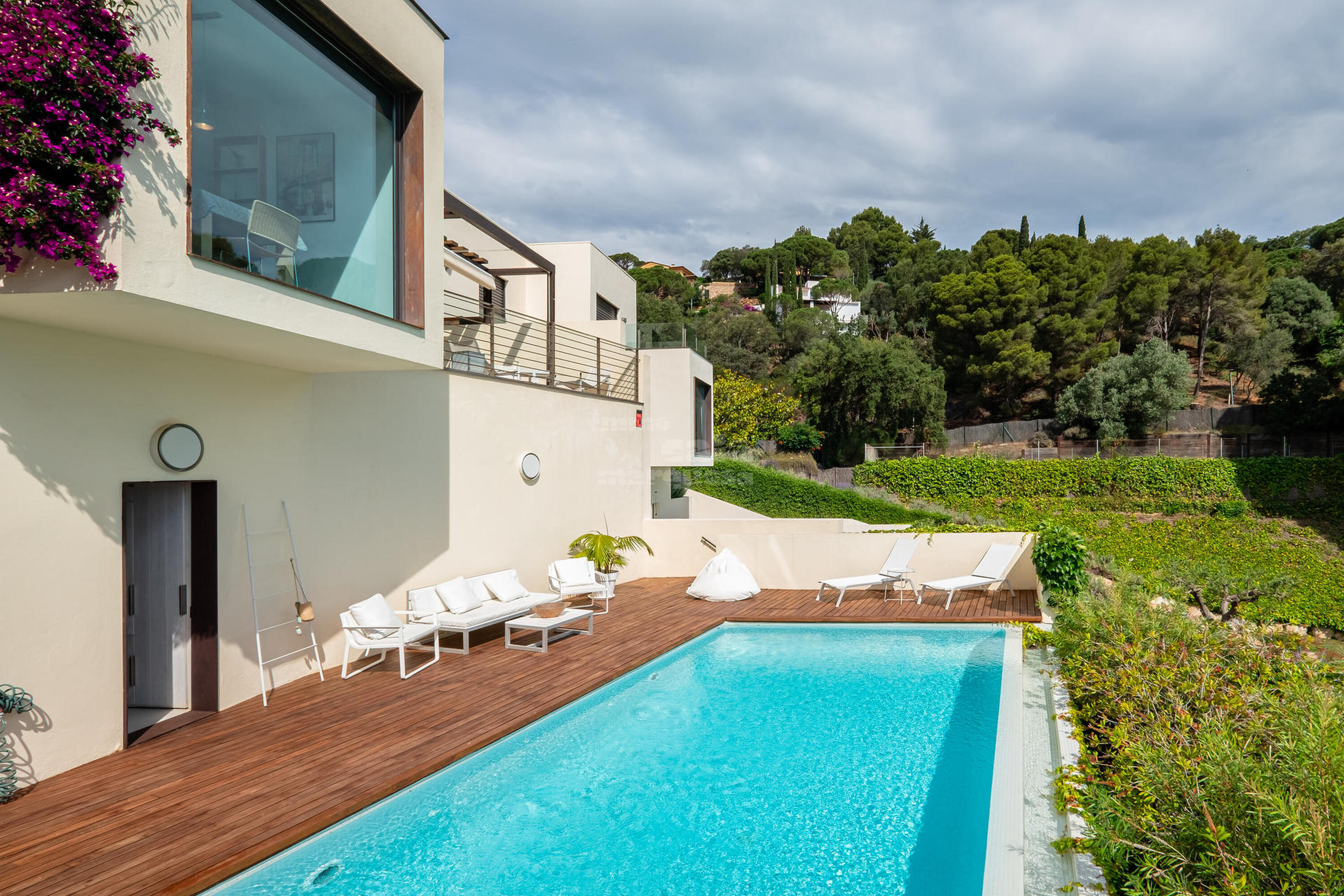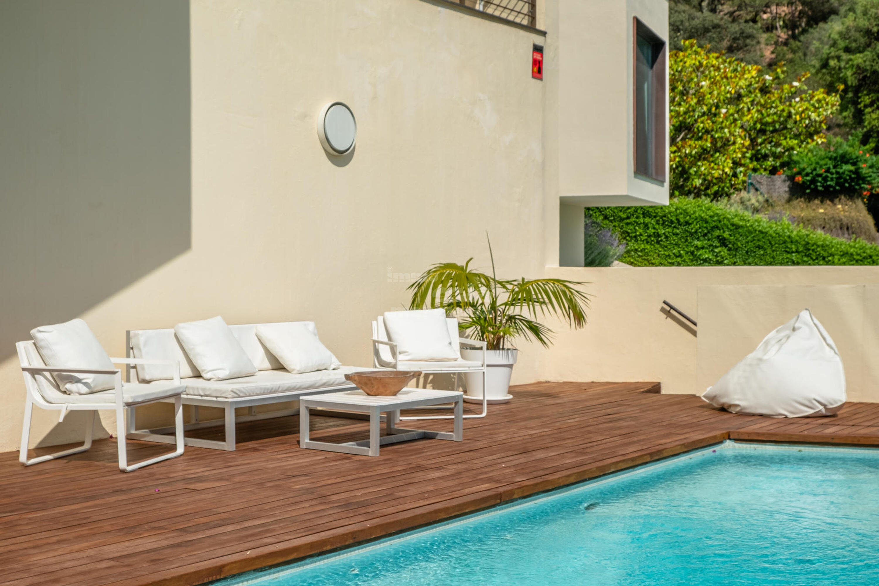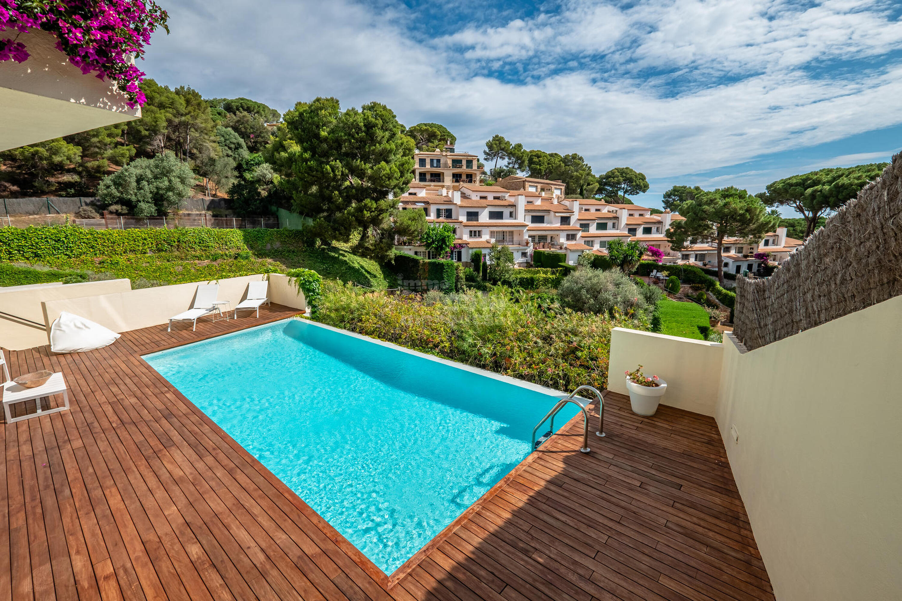 Baixant unes escales exteriors, s'accedeix a la piscina desbordant salada, i al jardí. En aquesta area també disposa de sofà i taula tipus chill-out, vestidor equipat amb zona de dutxa i nevera.