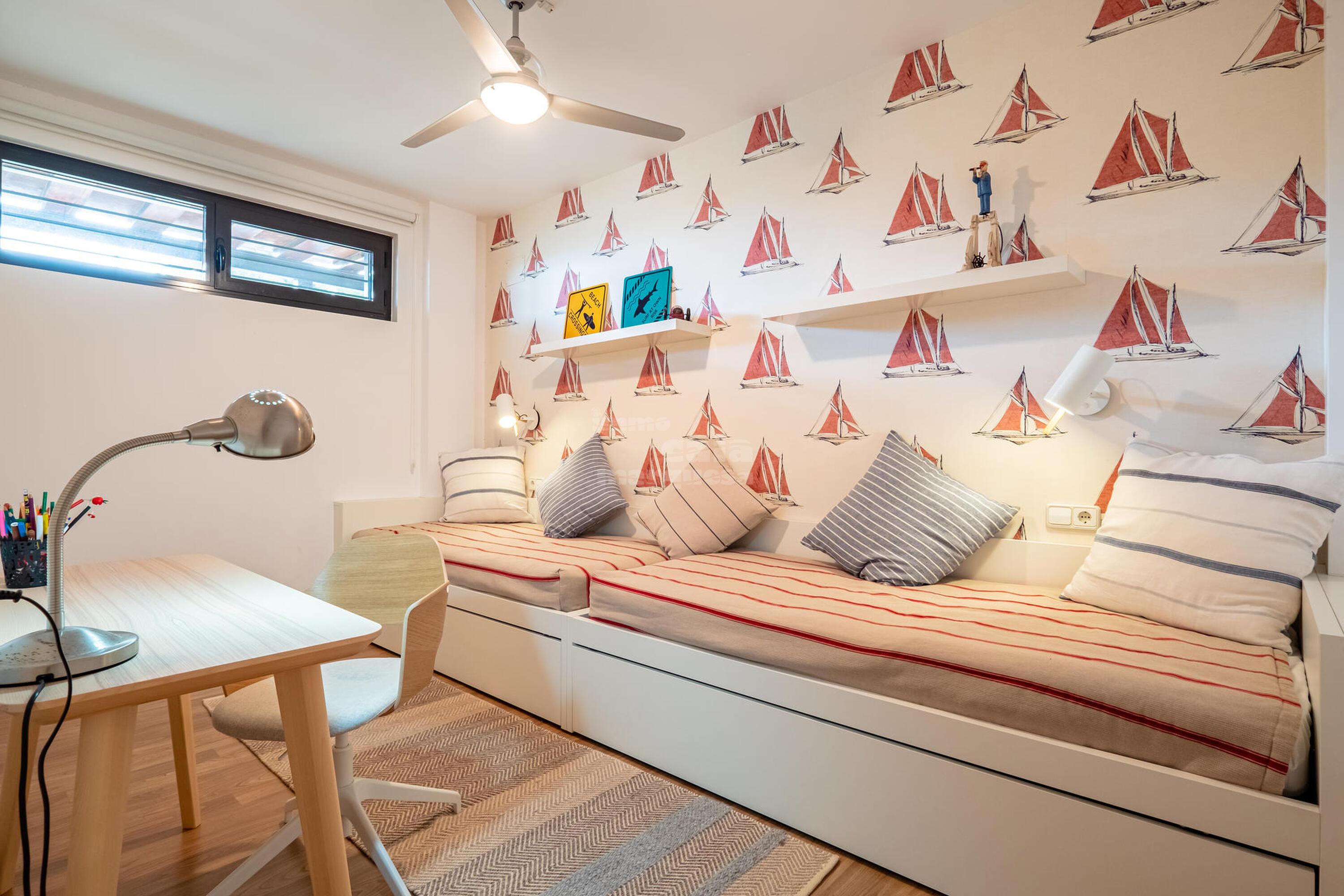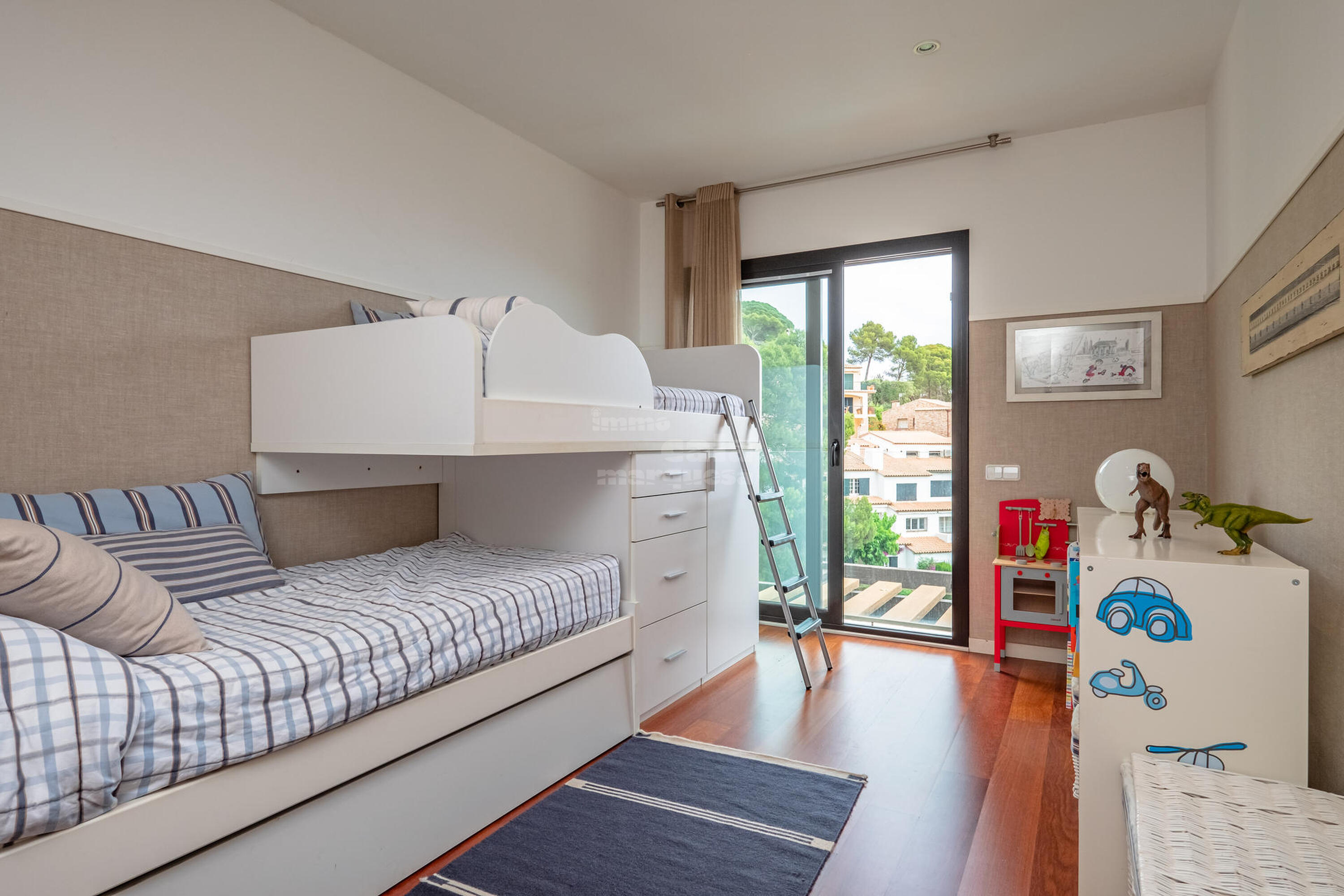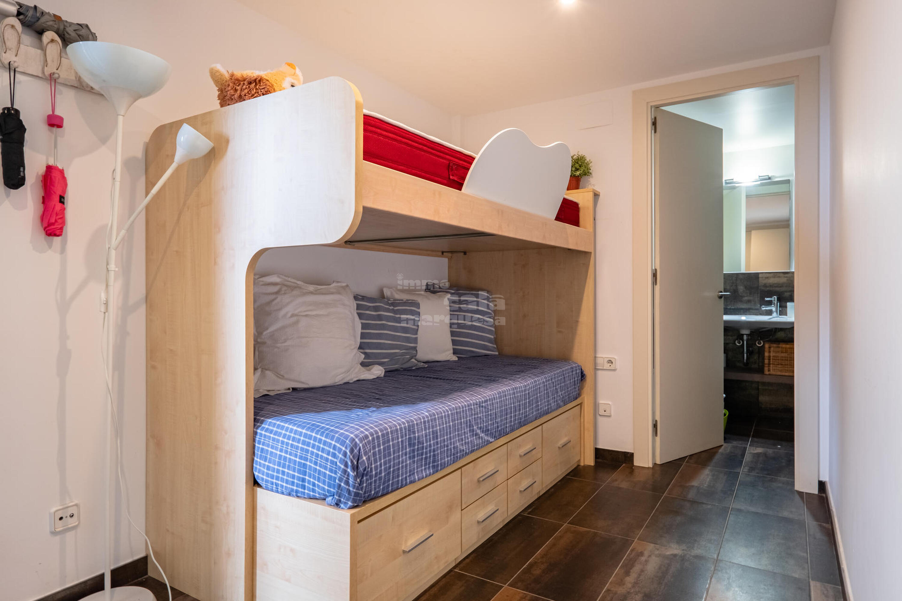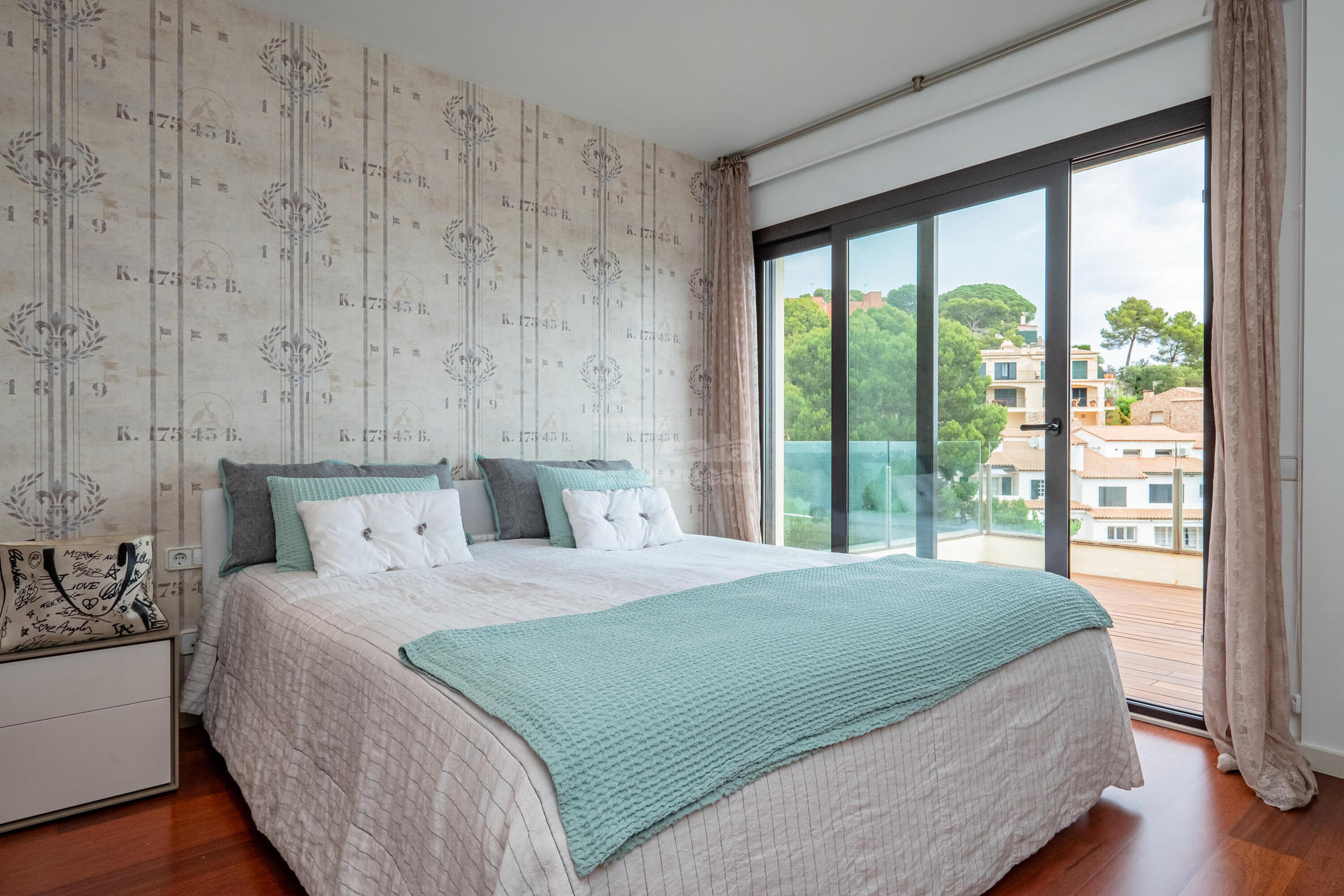 La casa està distribuïda en dues plantes. A la primera planta trobem 4 habitacions, una amb dos llits niu i bany amb dutxa, 2 habitacions dobles, una amb llit de matrimoni i una altra amb lliteres, un bany amb dutxa, habitació suite amb llit doble, bany amb dutxa, banyera i vestidor . A la segona planta, baixant les escales, es troba un gran saló menjador amb sortida a la terrassa, cuina oberta totalment equipada, amb osmosi, una habitació doble amb lliteres, bany amb dutxa i un lavabo de cortesia. Terrassa amb safareig.