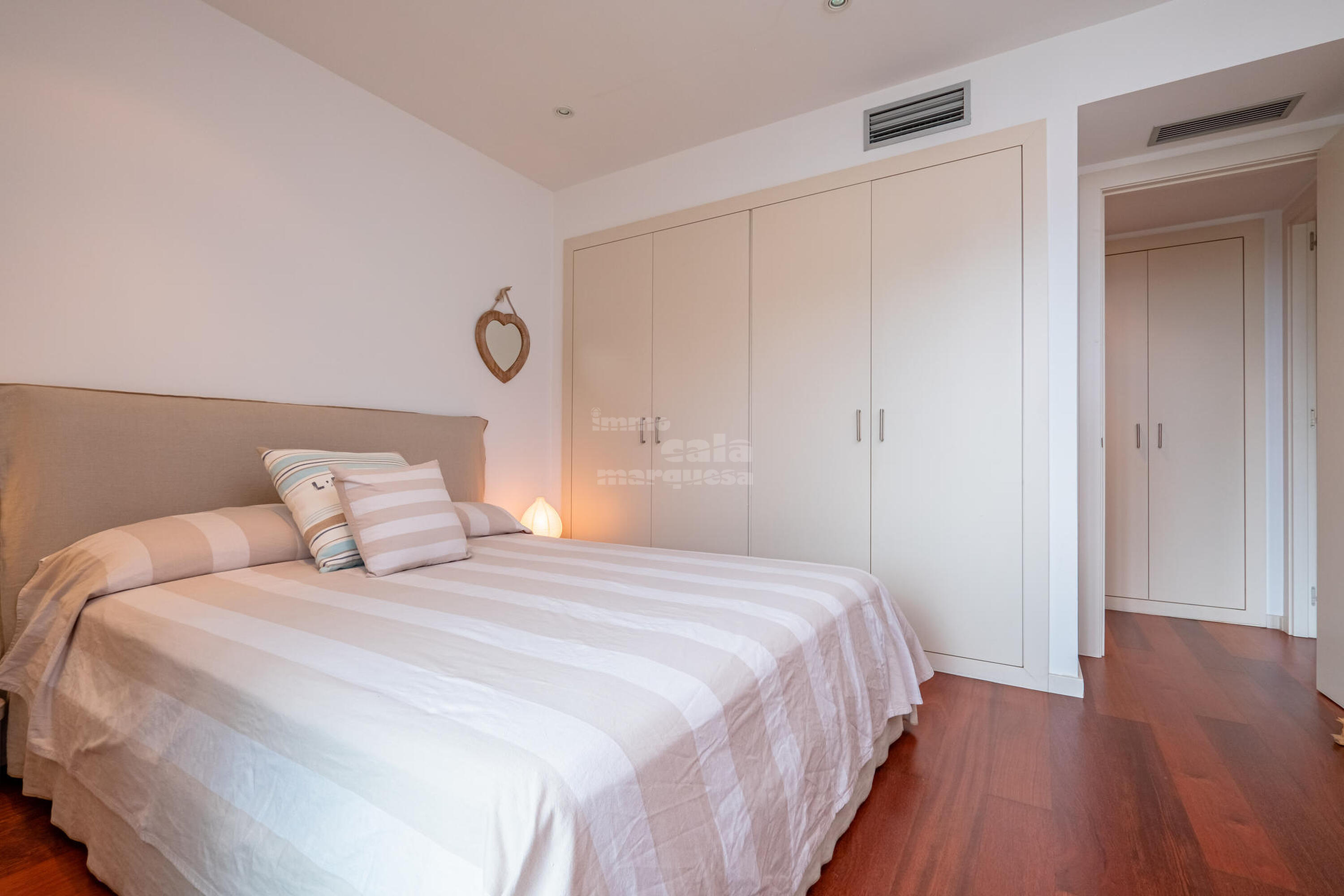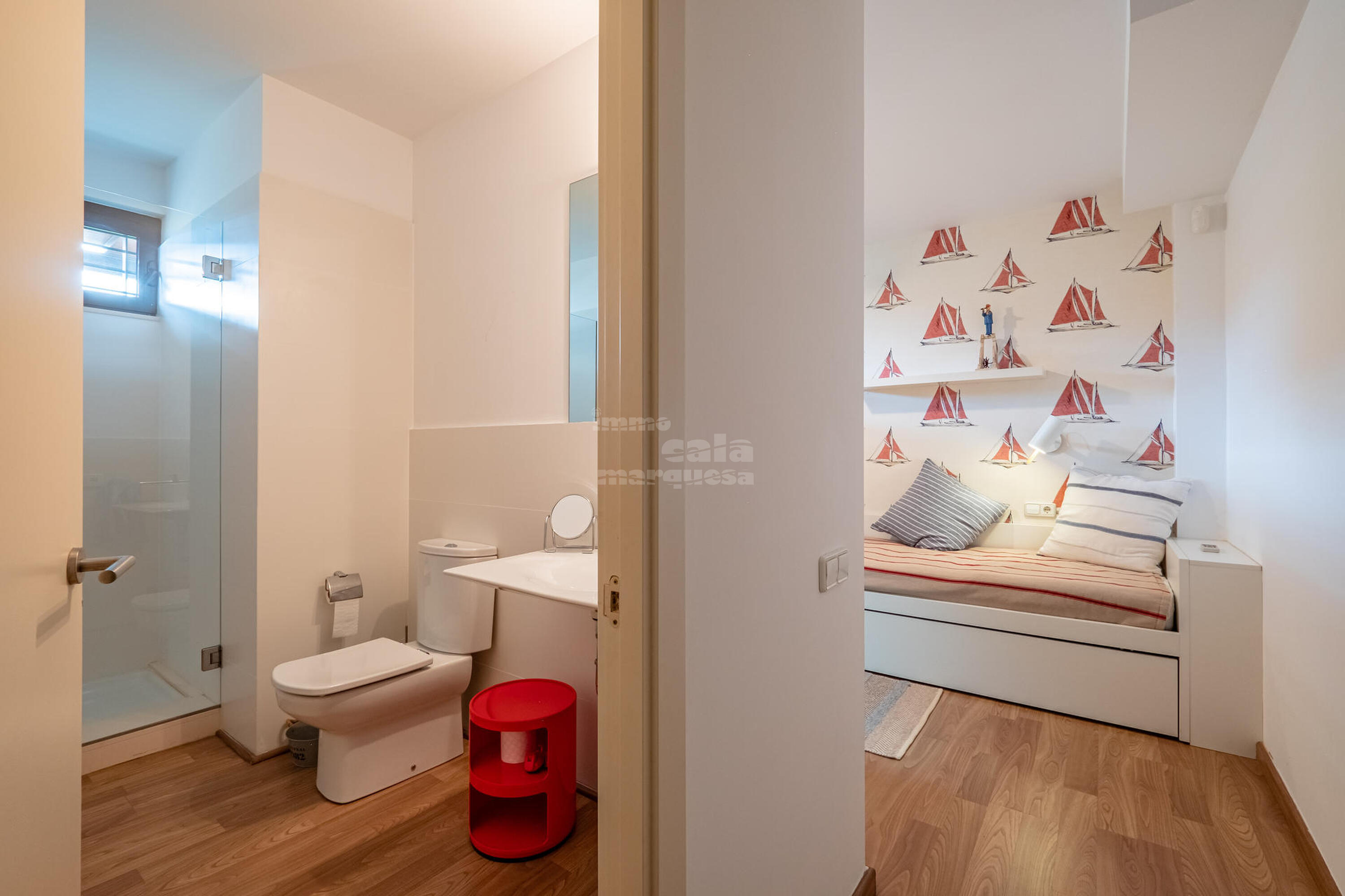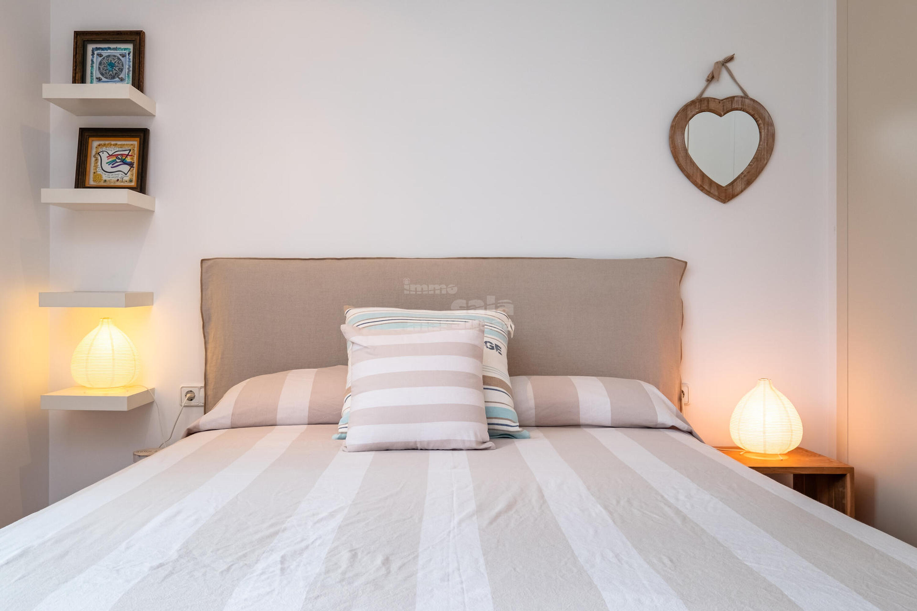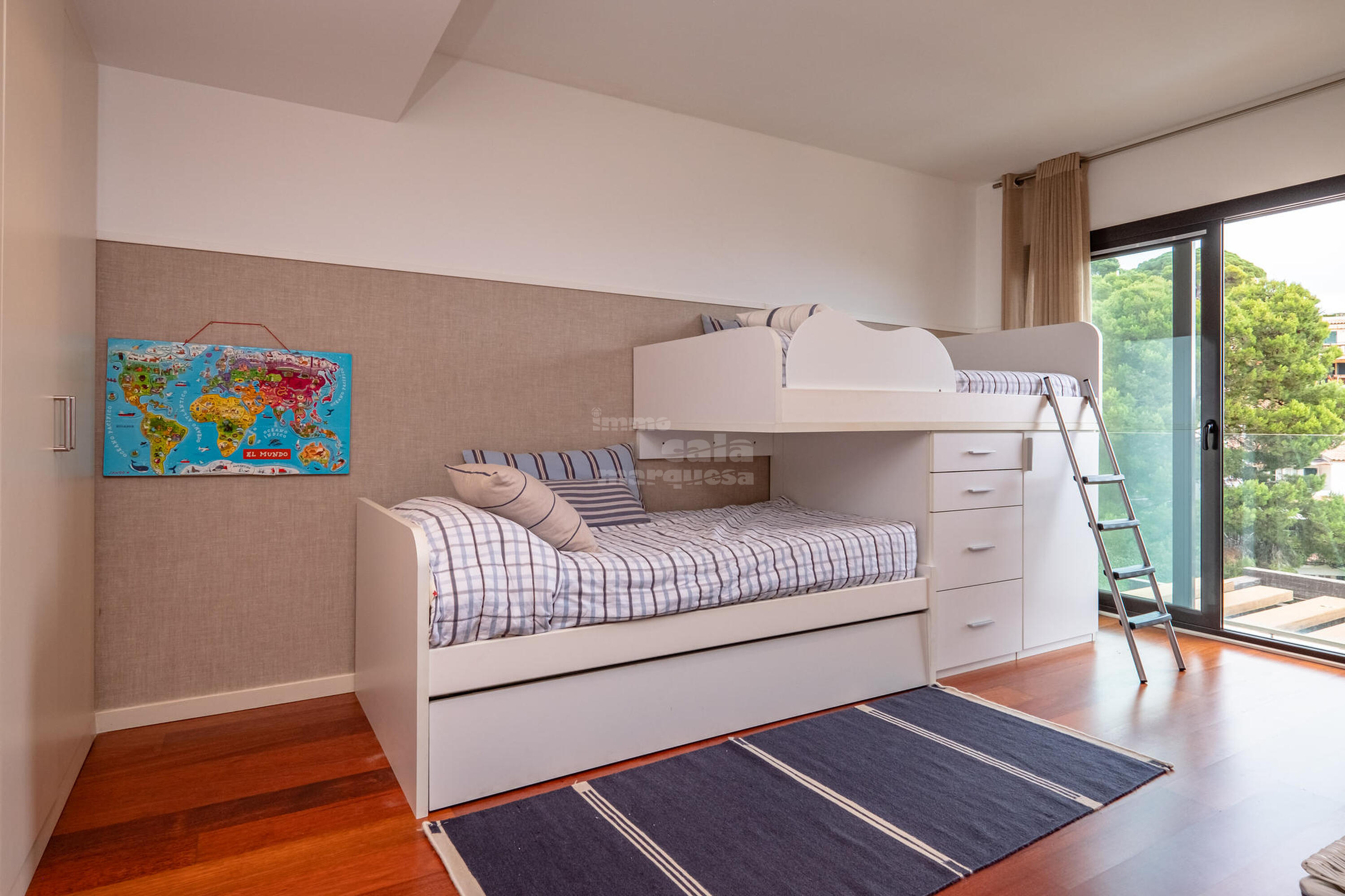 La casa està distribuïda en dues plantes. A la primera planta trobem 4 habitacions, una amb dos llits niu i bany amb dutxa, 2 habitacions dobles, una amb llit de matrimoni i una altra amb lliteres, un bany amb dutxa, habitació suite amb llit doble, bany amb dutxa, banyera i vestidor . A la segona planta, baixant les escales, es troba un gran saló menjador amb sortida a la terrassa, cuina oberta totalment equipada, amb osmosi, una habitació doble amb lliteres, bany amb dutxa i un lavabo de cortesia. Terrassa amb safareig.