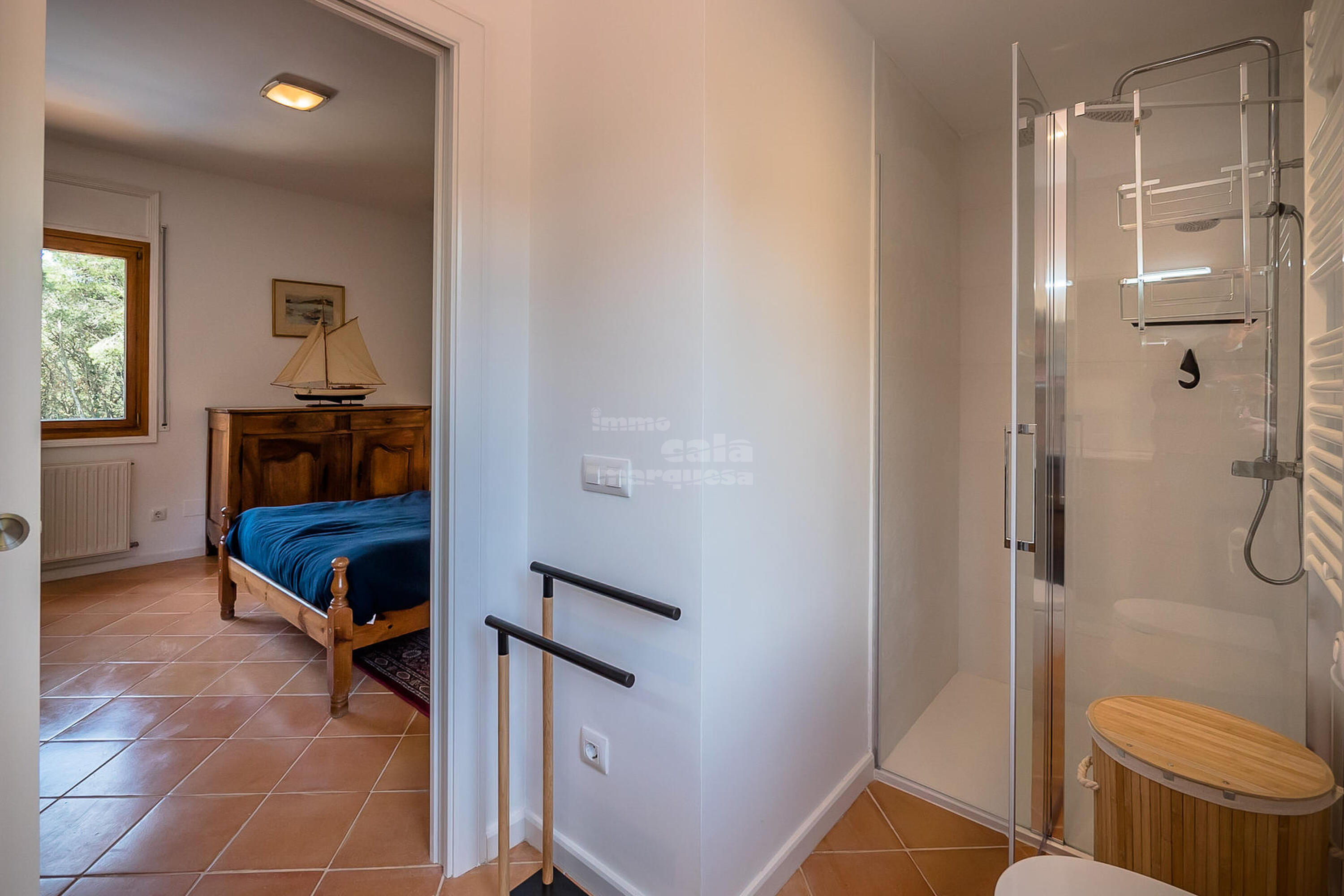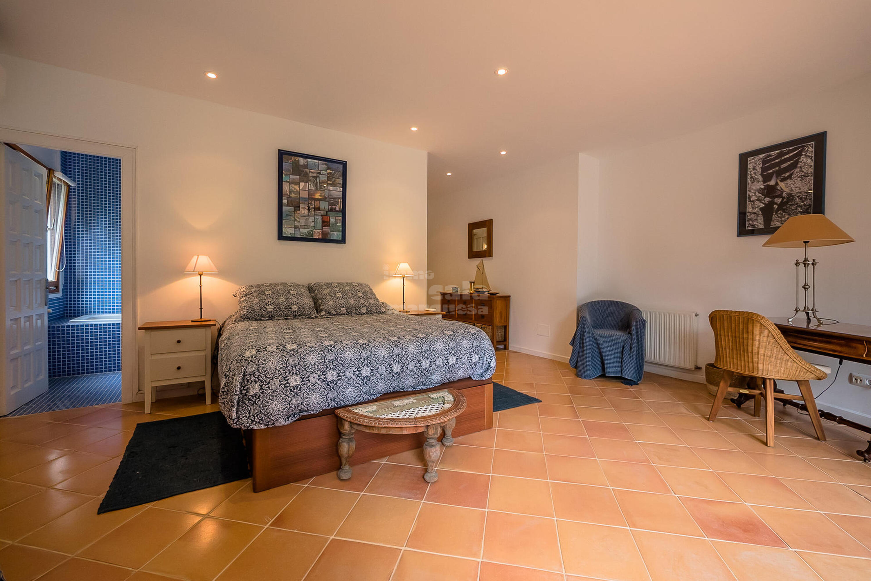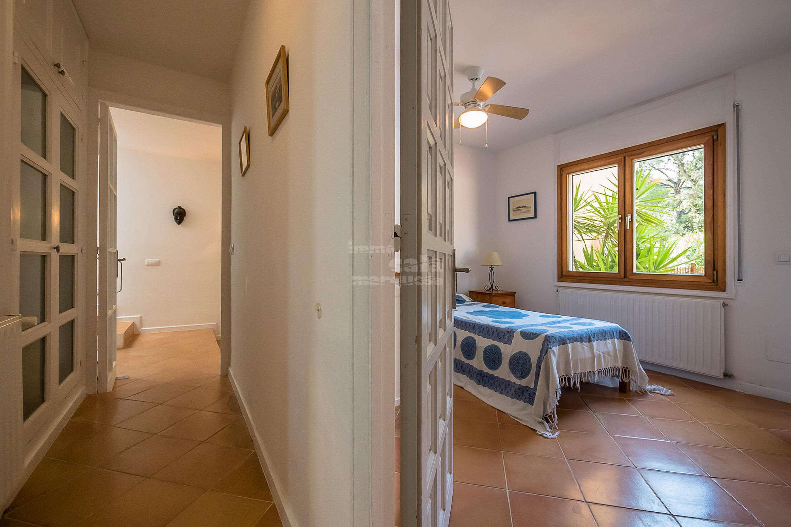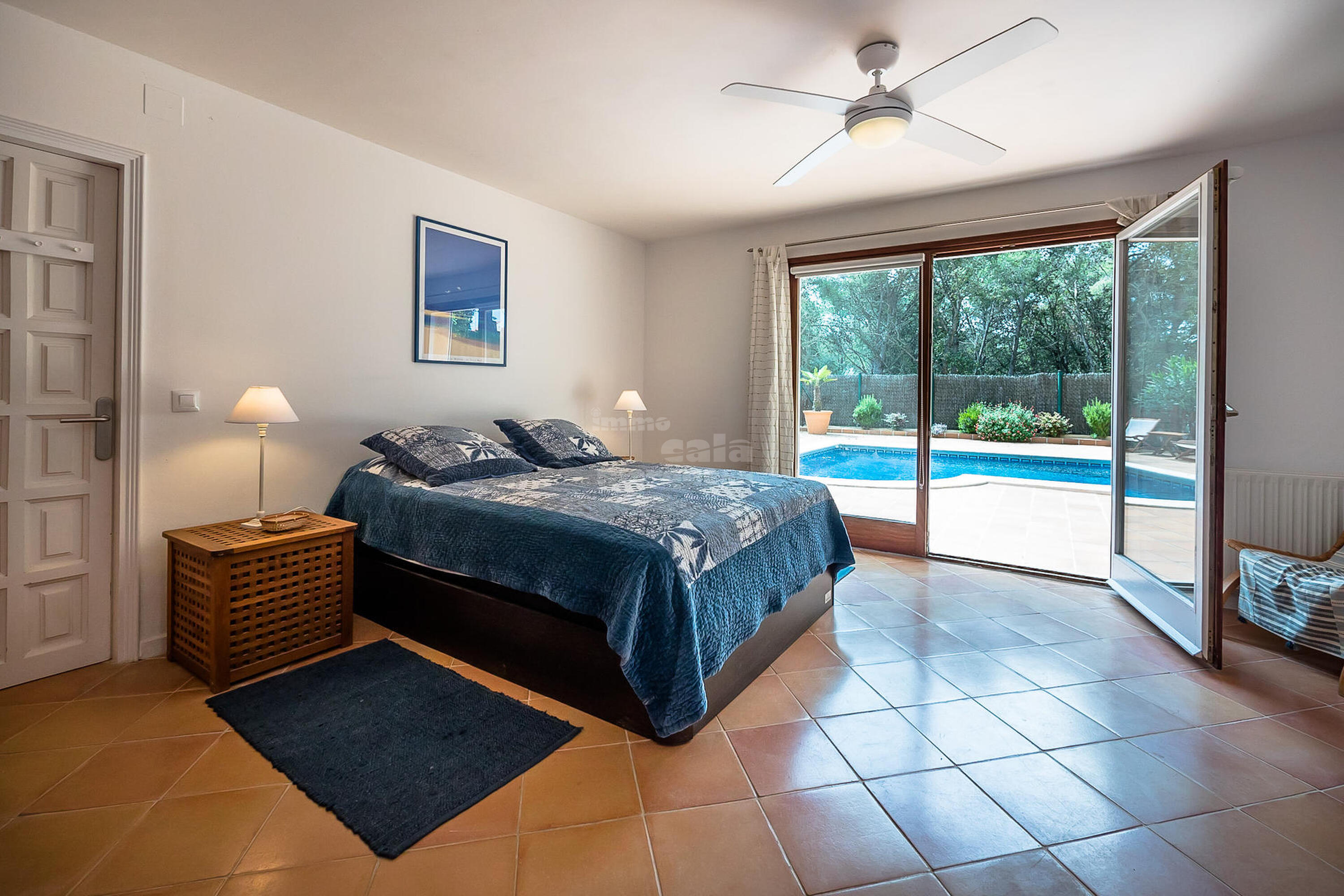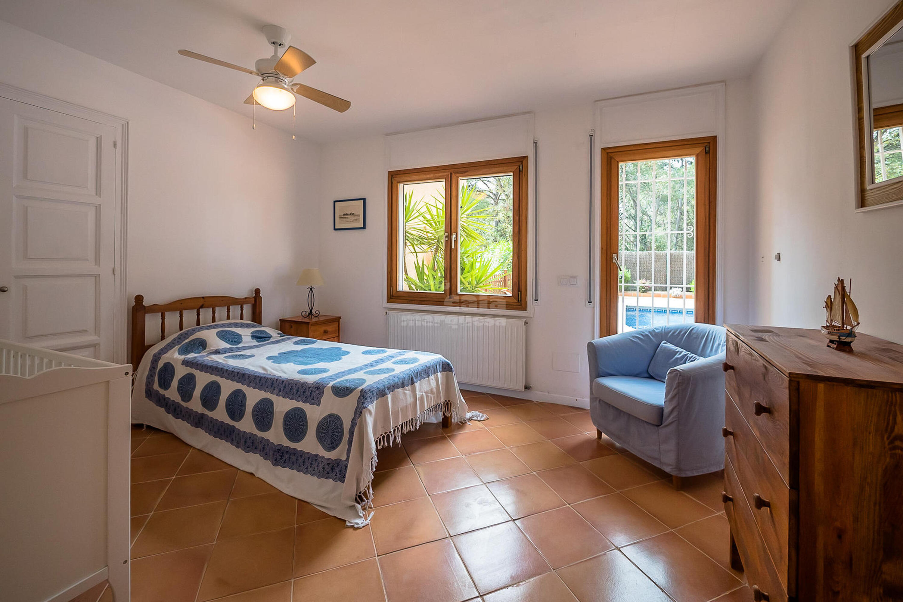 A la planta inferior hi ha la resta d'habitacions i el lavabo. Una doble amb dos llits individuals i una individual que comparteixen un bany amb banyera. Una suite amb bany amb banyera i sortida directa a jardí i una altra suite amb sortida a la piscina i bany amb dutxa.