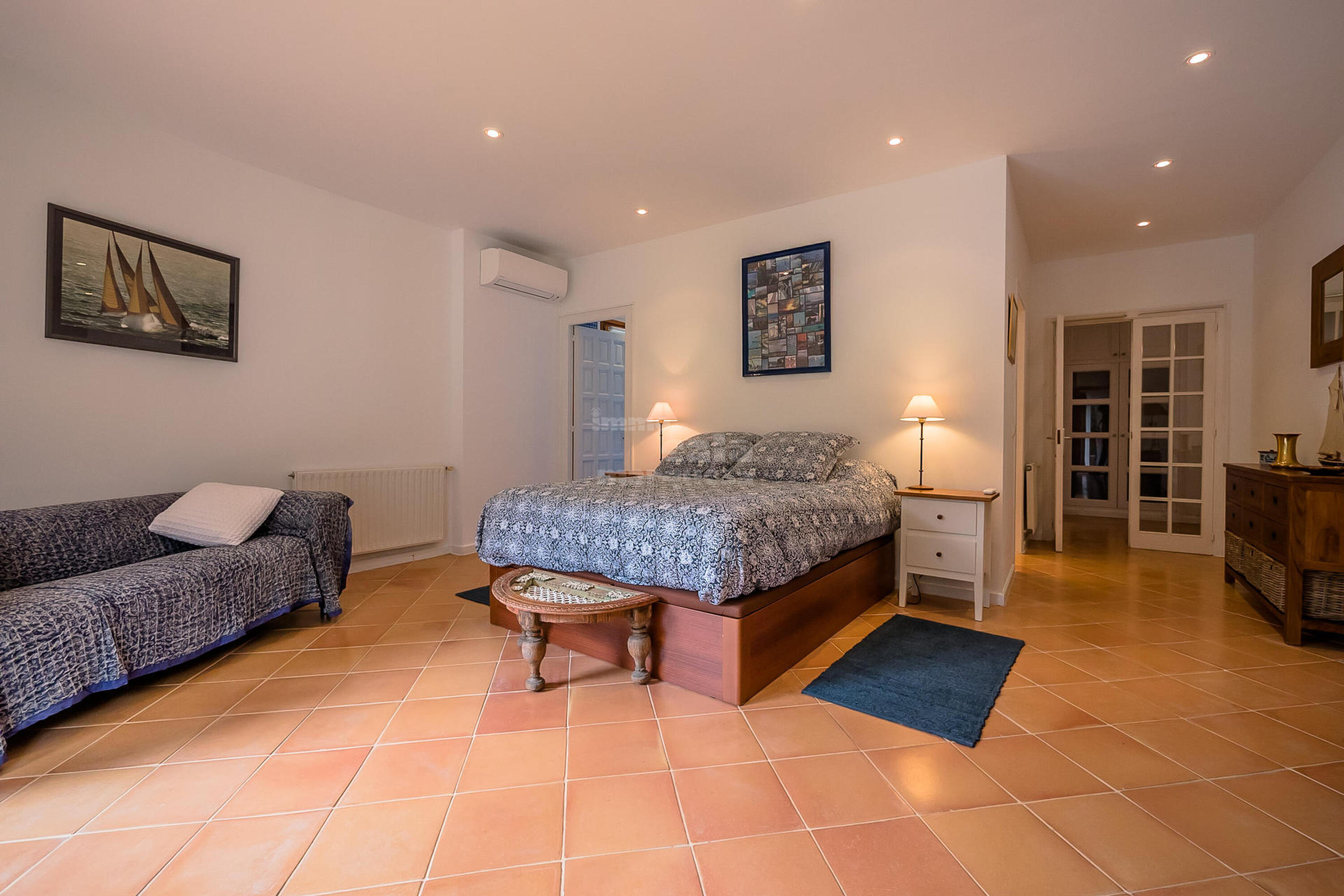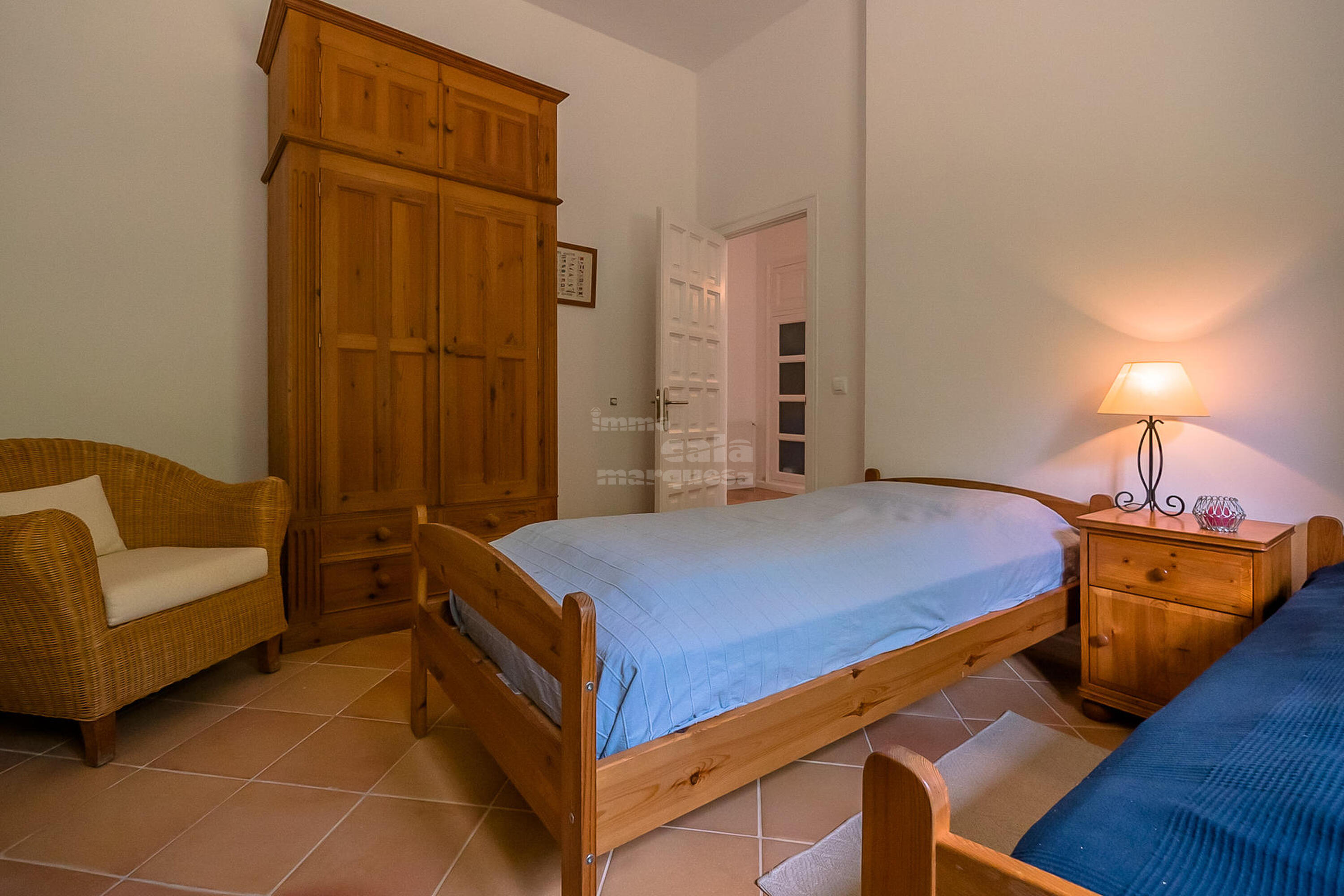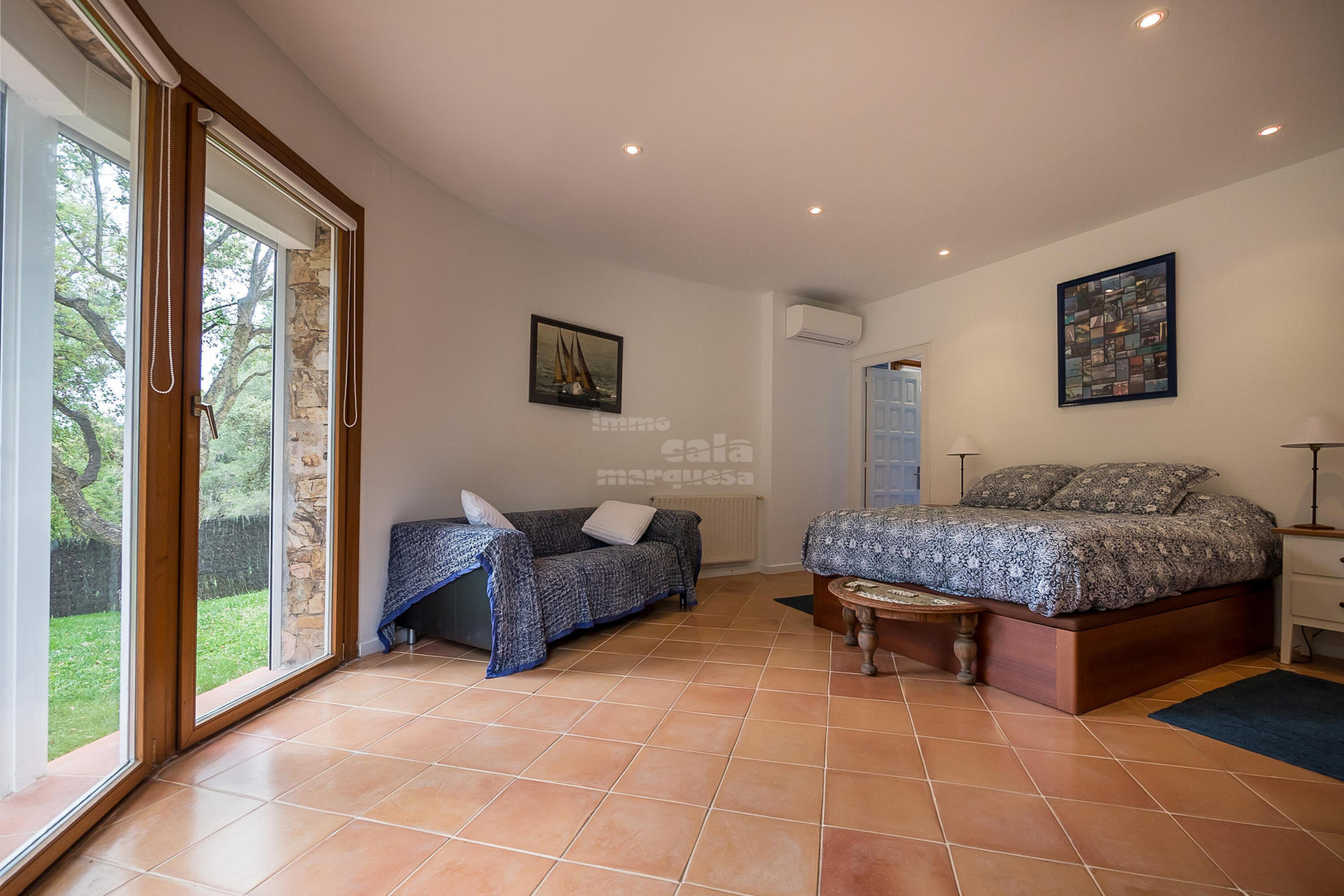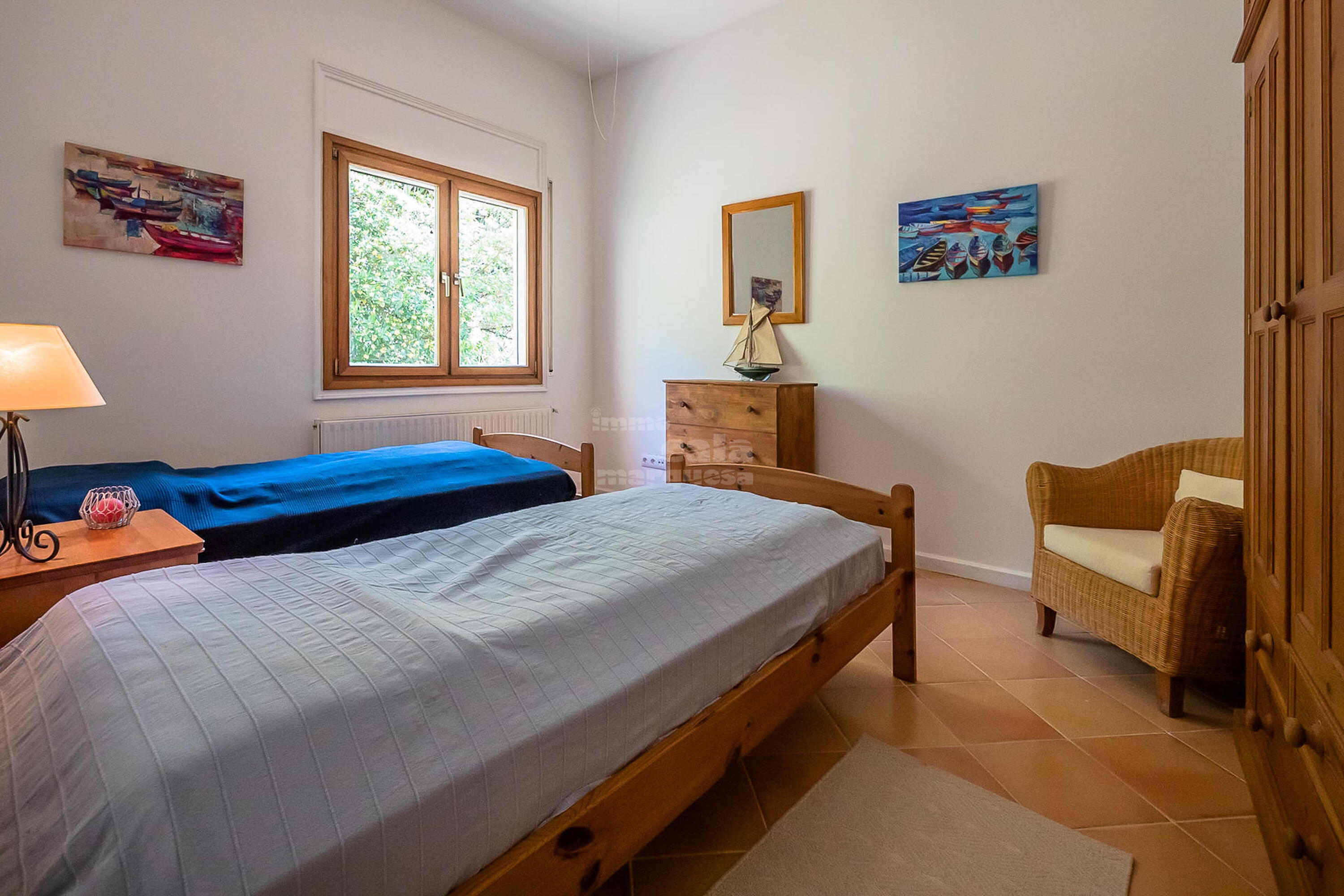 A la planta inferior hi ha la resta d'habitacions i el lavabo. Una doble amb dos llits individuals i una individual que comparteixen un bany amb banyera. Una suite amb bany amb banyera i sortida directa a jardí i una altra suite amb sortida a la piscina i bany amb dutxa.