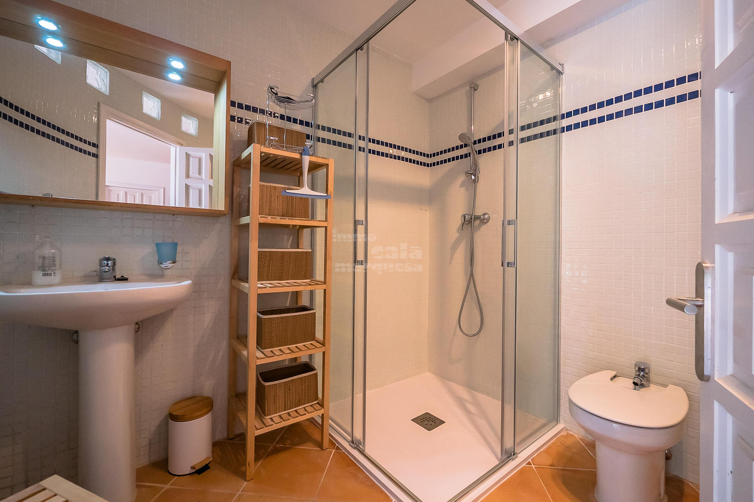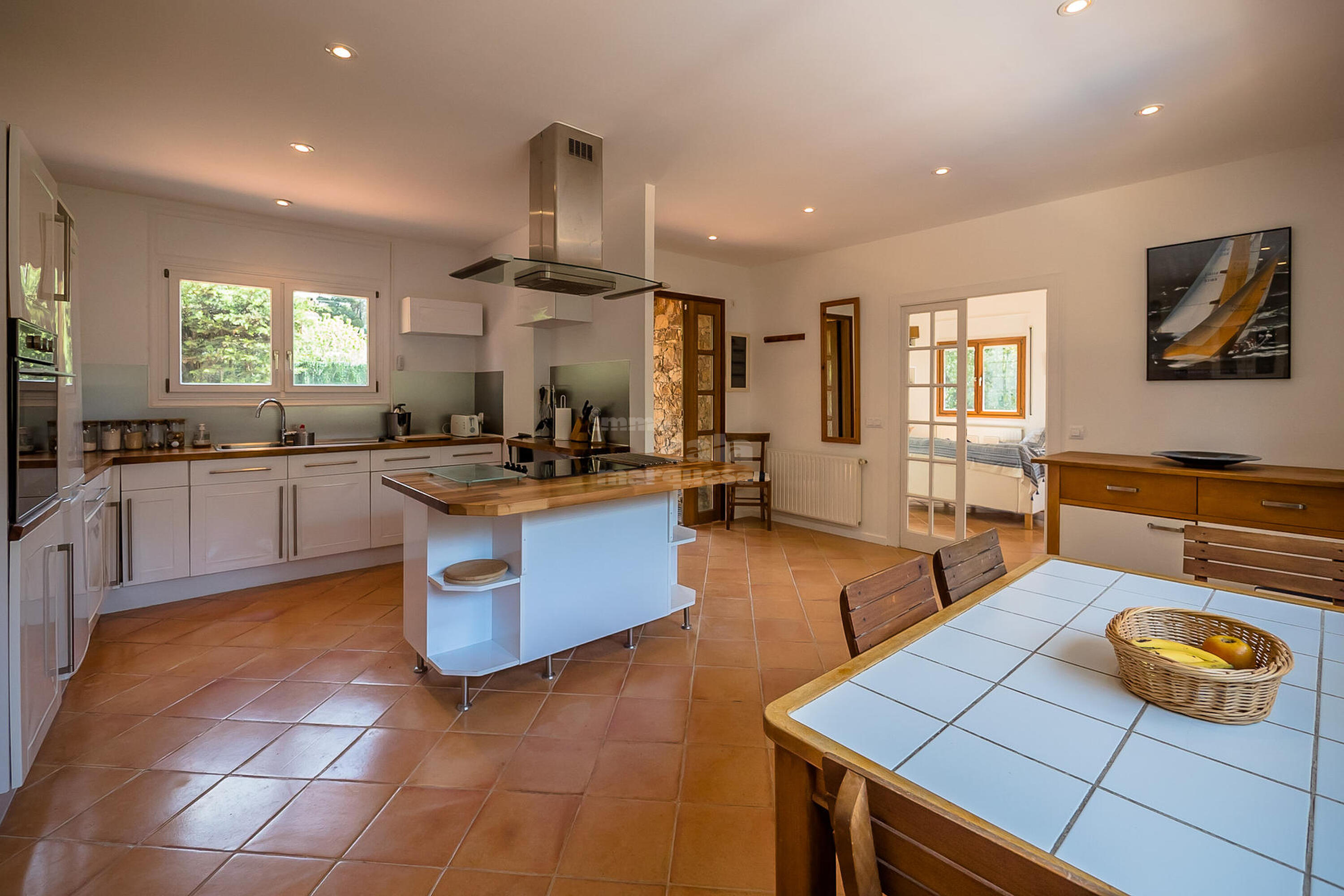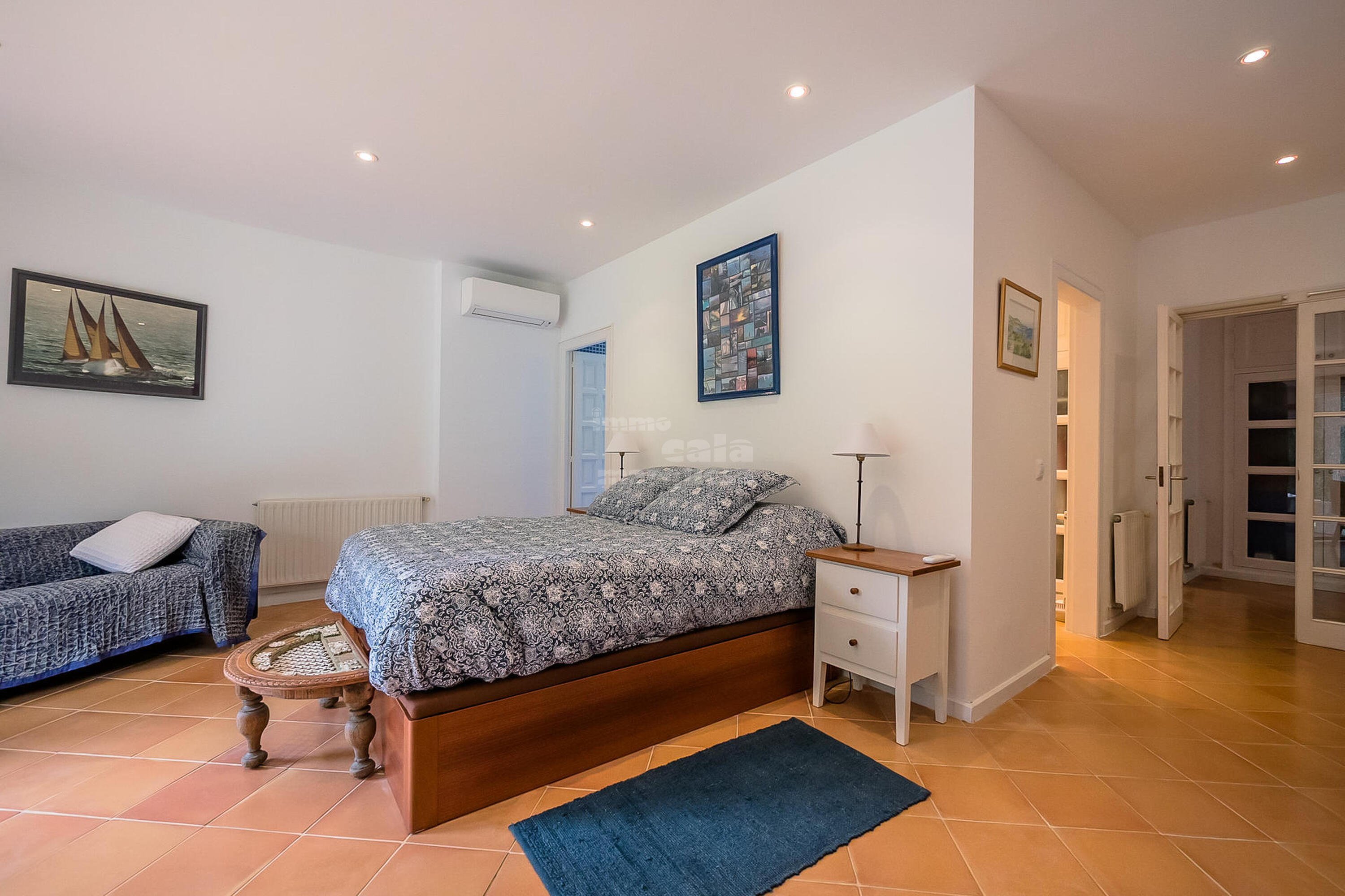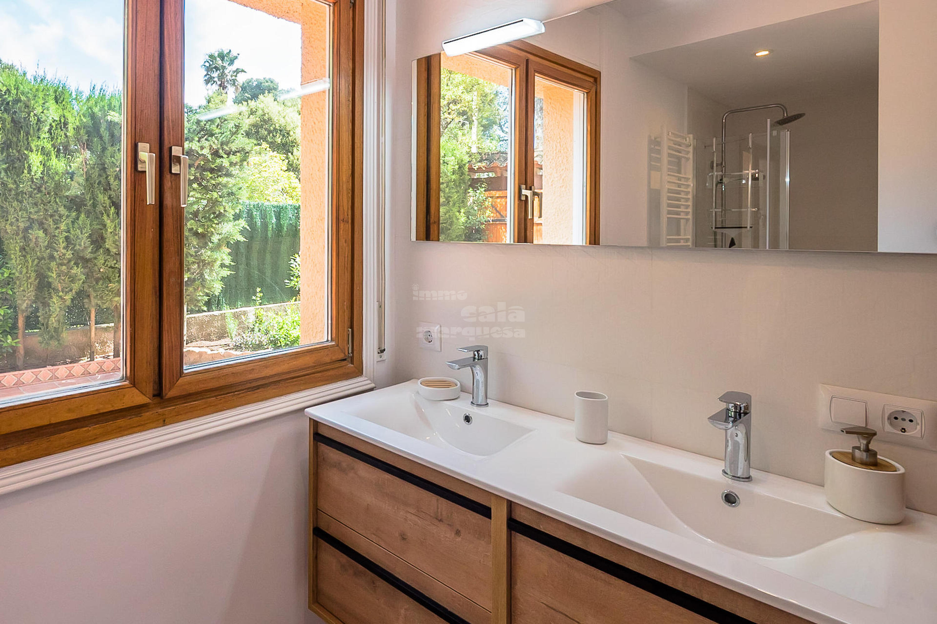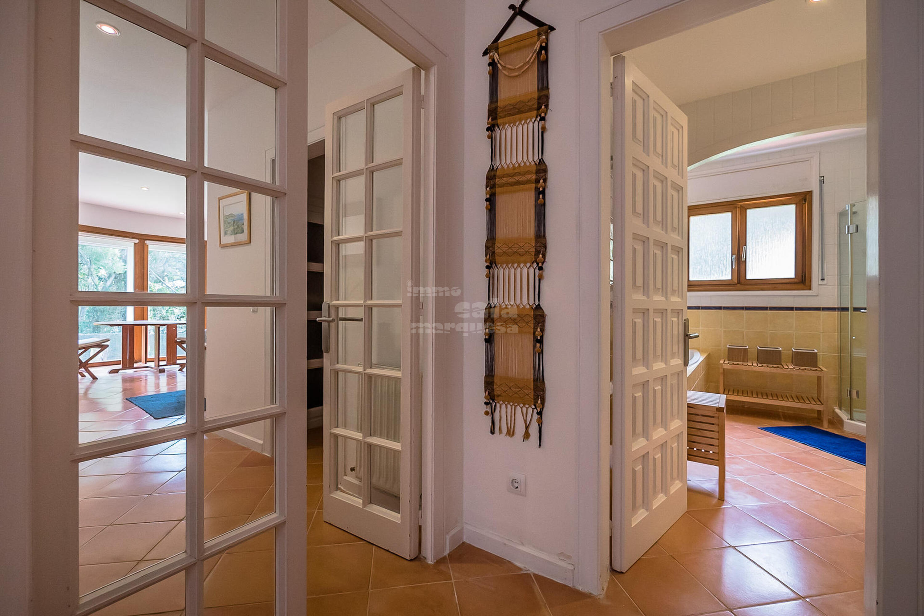 A la planta inferior hi ha la resta d'habitacions i el lavabo. Una doble amb dos llits individuals i una individual que comparteixen un bany amb banyera. Una suite amb bany amb banyera i sortida directa a jardí i una altra suite amb sortida a la piscina i bany amb dutxa.
