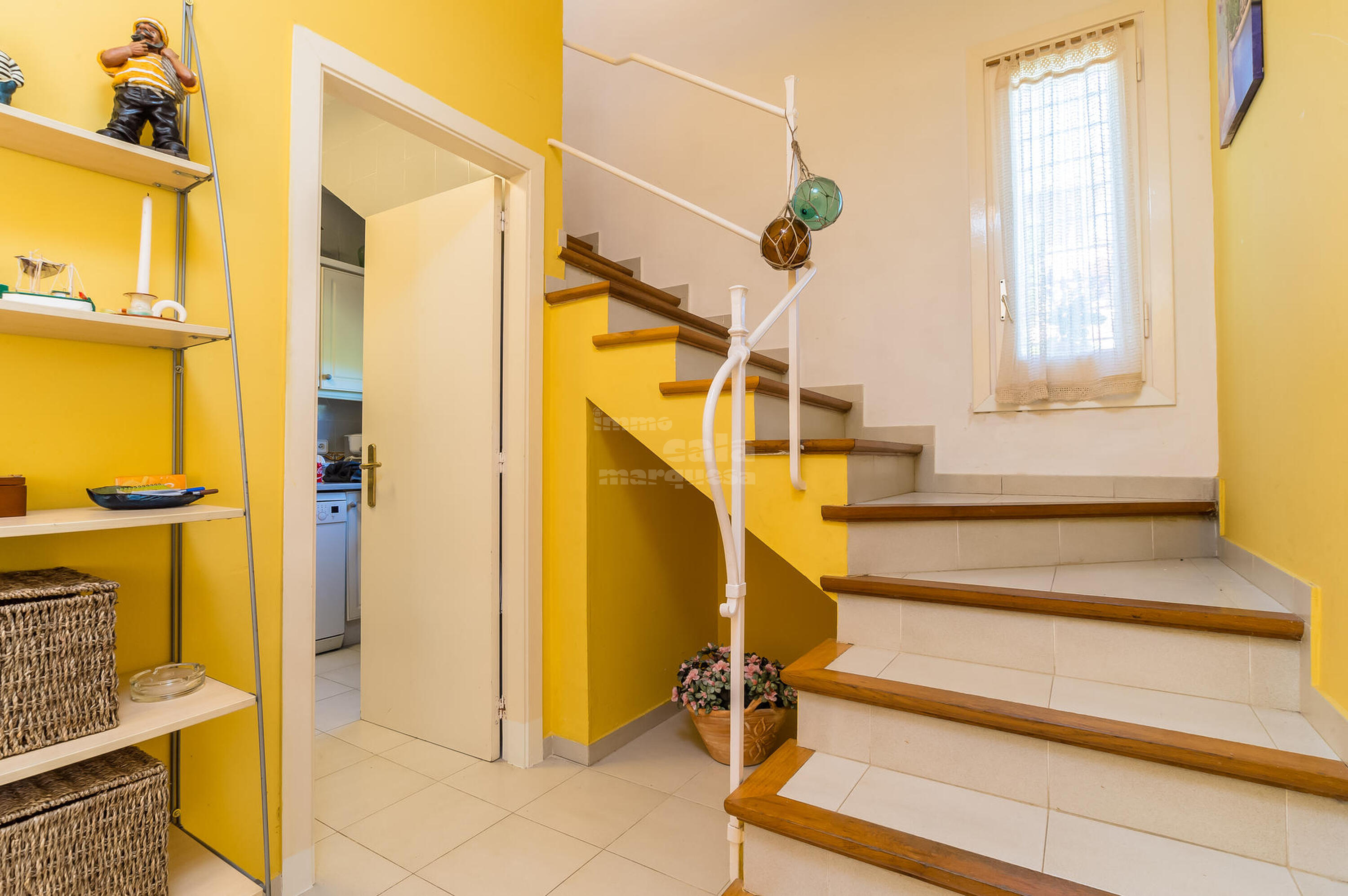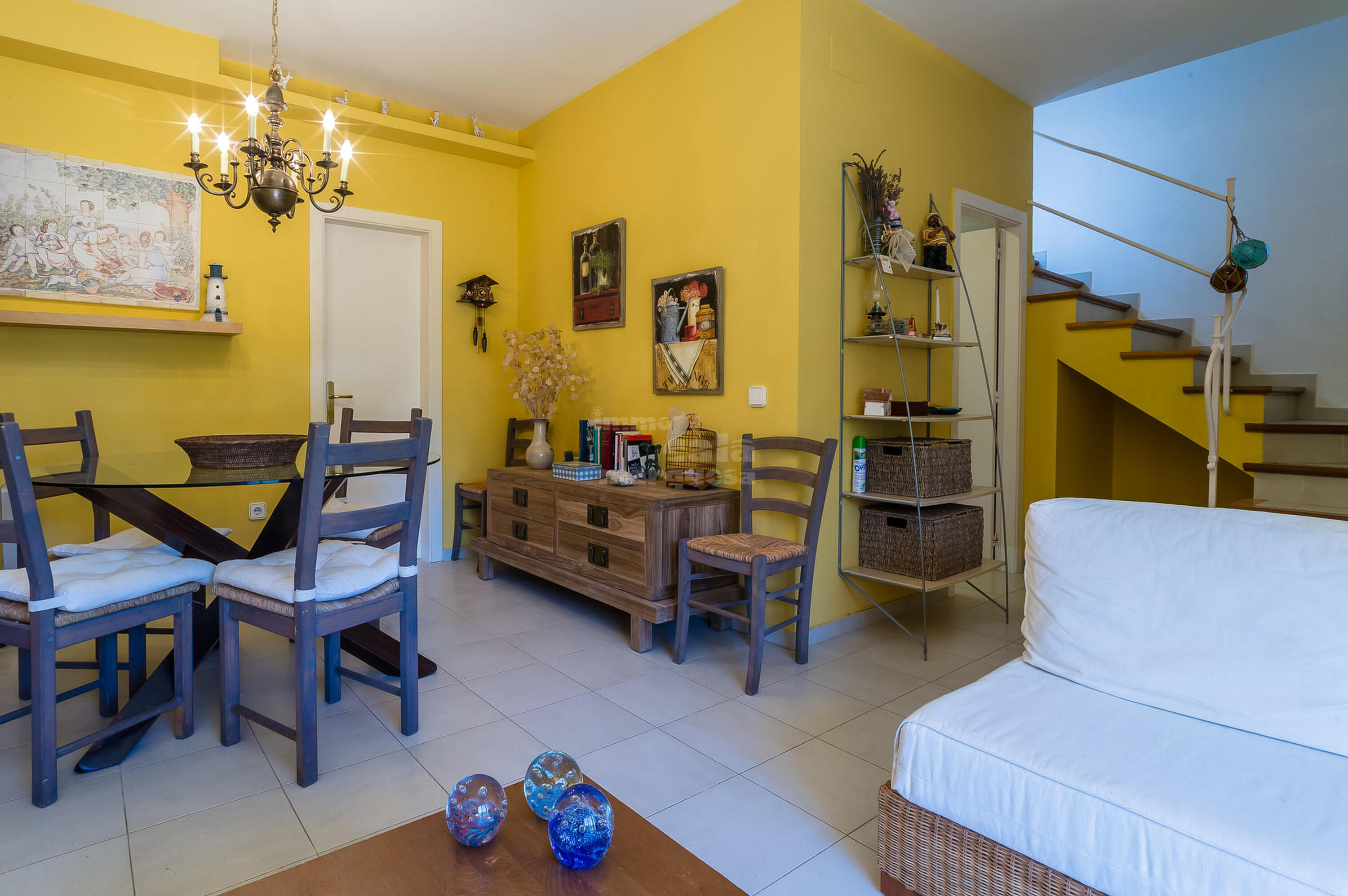 En la planta entrada hay un salón comedor, un aseo de cortesia y cocina equipada. En la planta superior se encuentran las tres habitaciones dobles, la primera dispone de dos camas individuales con salida a terraza, la segunda habitación es de matrimonio, baño con ducha y una tercera habitación en suite con cama doble, baño con bañera y salida a terraza. Tiene una bonita terraza con jardín privado muy soleado y barbacoa.